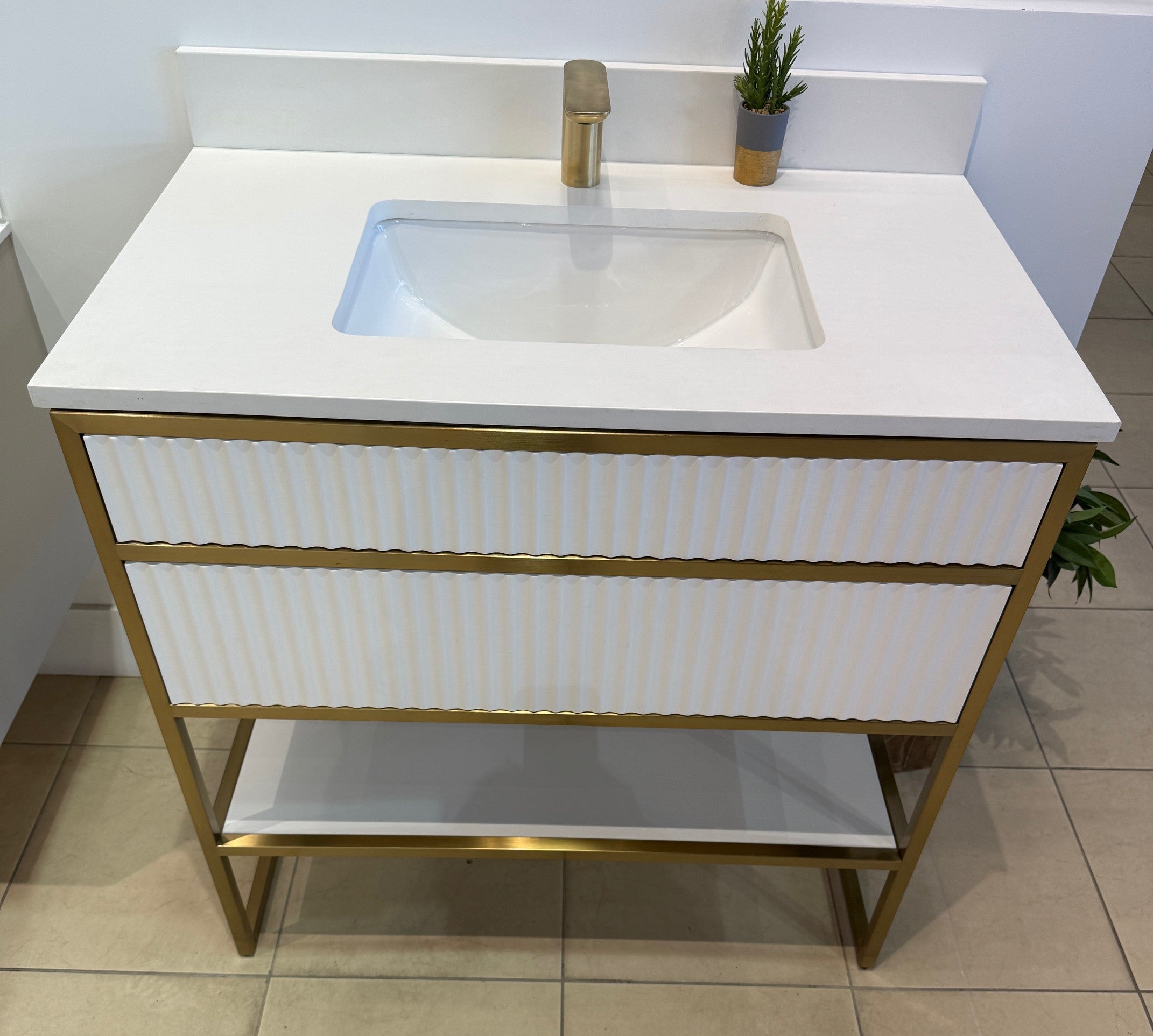 White and Brushed Gold with White Quartz Countertop and ceramic undermount sink