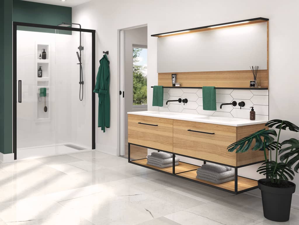 The Vanico Maronyx Fuzion collection highlights matte black metallic accents and comes in 4 different versions. The suspended version with niches fits perfectly into a contemporary and light environment.